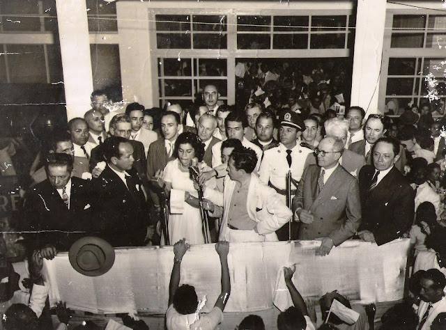 Mais um registro fotográfico do acervo de Socorro França. O que parece ser um comício, ilustres do passado campinense e paraibano se exibem em varanda. Identificamos algumas pessoas, a exemplo de Elpídio de Almeida, Hilton Motta (segurando o microfone), José Américo, Plínio Lemos, Severino Cabral e Otávio Amorim.